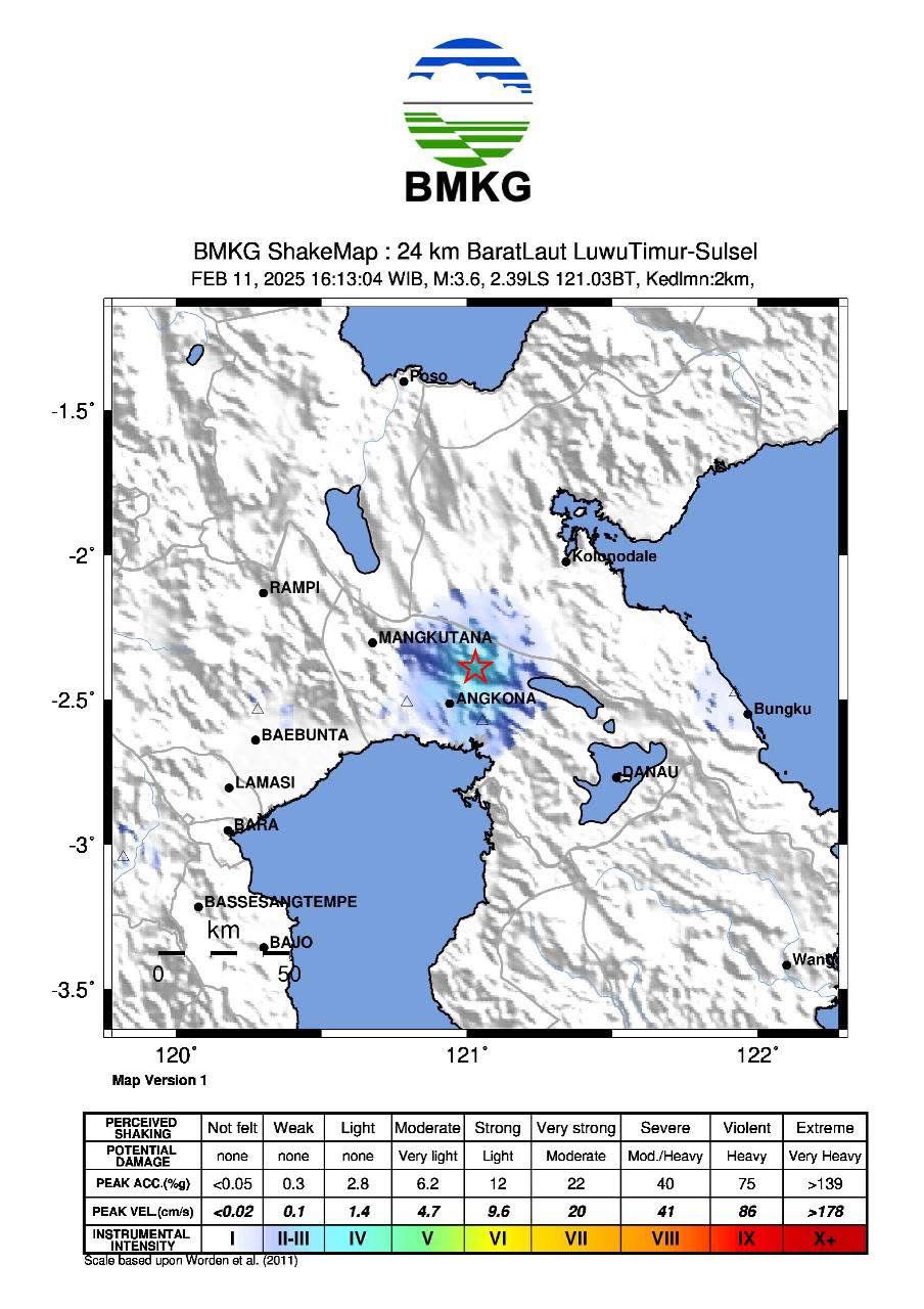 | Keterangan | GEMPABUMI TEKTONIK M3.6 DIRASAKAN DI MALILI, KAB. LUWU TIMUR, SULAWESI SELATAN Kejadian dan Parameter Gempabumi: Hari Selasa, 11 Februari 2025 pukul 17:13:04 WITA, wilayah Malili Kabupaten Luwu Timur Provinsi Sulawesi Selatan diguncang gempabumi tekto |